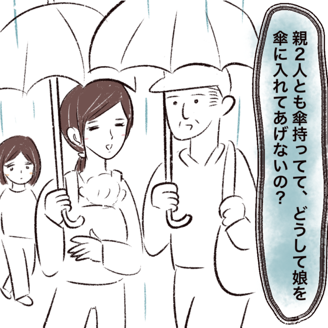(親2人とも傘持ってて、どうして娘を傘に入れてあげないの?)