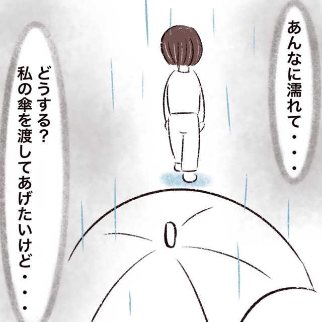 (あんなに濡れて・・・どうする?私の傘を渡してあげたいけど・・)と悩むまるさん。