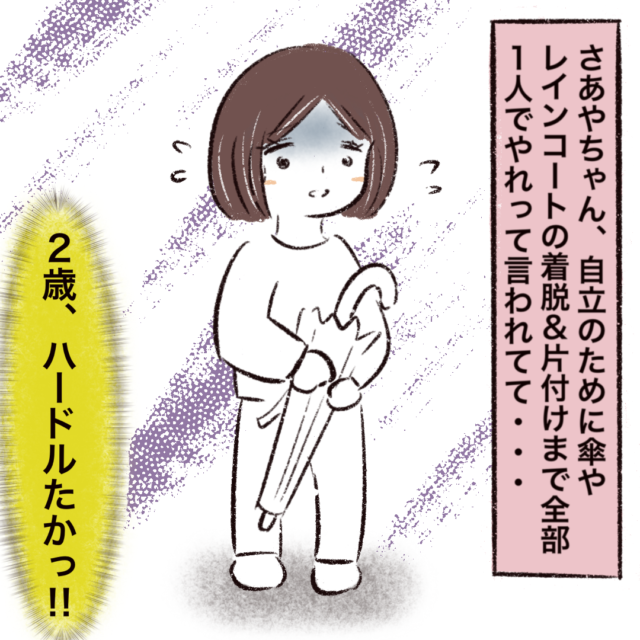 「さあやちゃん、自立のために傘やレインコートの着脱&片付けまで全部1人でやれって言われてて・・・」