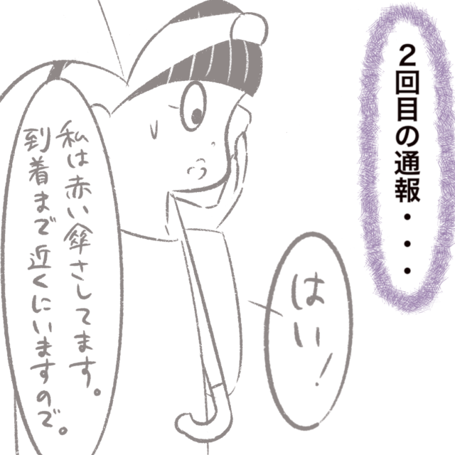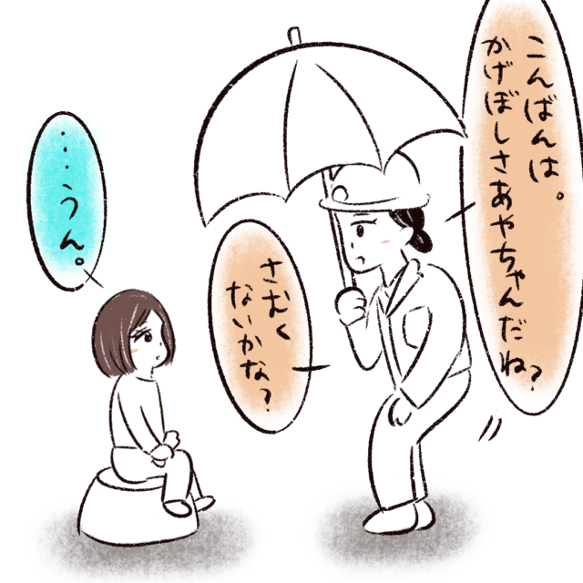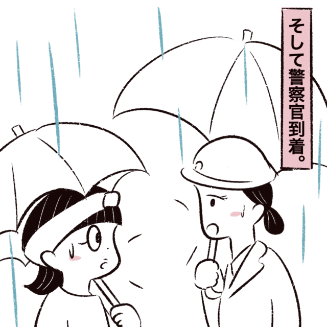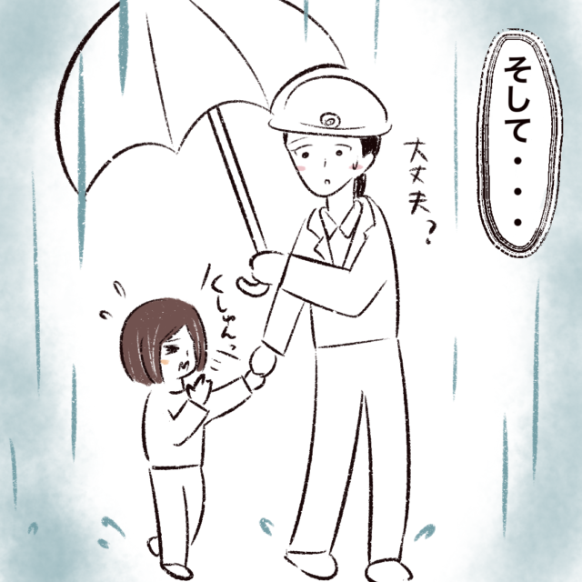 自分のことを「おーちゃん」と名乗る保育園児のさあやちゃん。公園で出会ってからしつこく付きまとわれるようになったまるさんは、対応に困りできる限り関わりを避けることを心がけていました。ある日、雨が降る夕方の公園で一人で夜ご飯を食べるさあやちゃんを見かけ、見過ごせず二度目の警察への通報をしたまるさん。警察官が到着するまでそっとさあやちゃんを見守ることにしました。