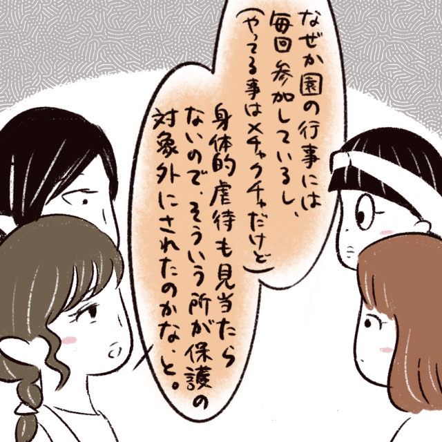 「なぜか園の行事には毎回参加しているし(やってる事はメチャクチャだけど)、身体的虐待も見当たらないので、そういう所が保護の対象外にされたのかな、と」