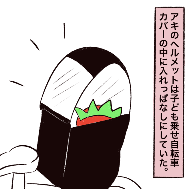 アキくんのヘルメットは子ども乗せ自転車カバーの中に入れっぱなしにしていたまるさん。
