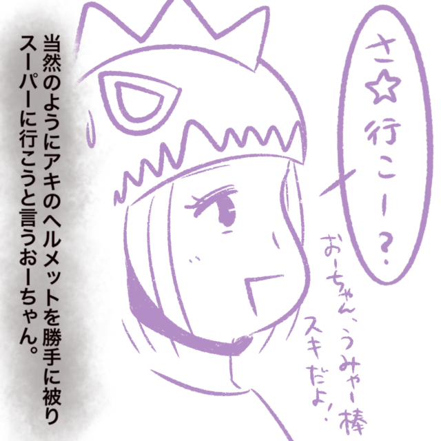 当然のようにアキくんのヘルメットを勝手に被り、スーパーに行こうと言うおーちゃん・・・。
