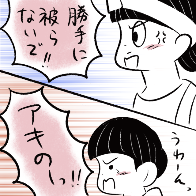 自分のヘルメットをとられ泣きだすアキくん・・・。