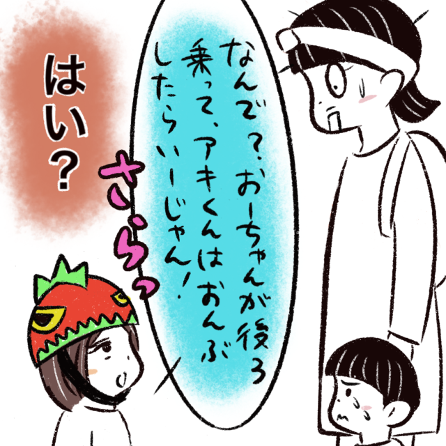 「なんで?おーちゃんが後ろ乗って、アキくんはおんぶしたらいーじゃん!」