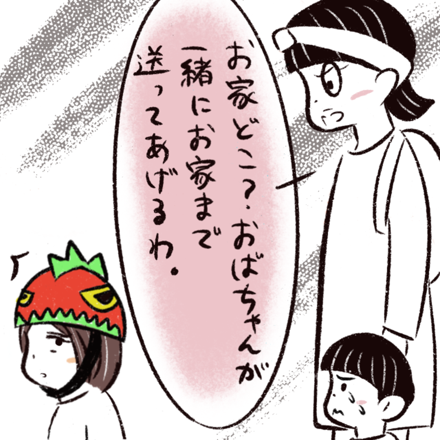 「お家どこ?おばちゃんが一緒にお家まで送ってあげるわ」