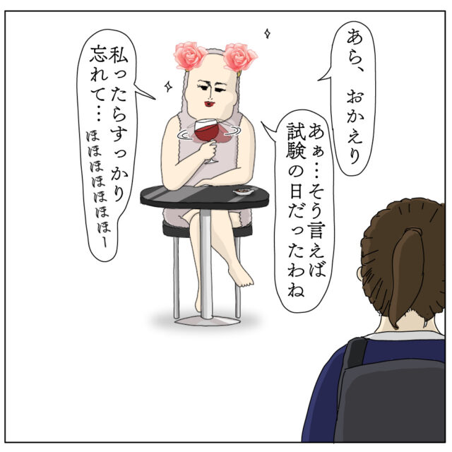 中学3年生の長女リコちゃん、ついに志望校の桃栗高校の受験日を迎えました。母であるチャーさんは「受験場では自分がこの中で一番頭がいいと思うんだ」とアドバイスし「天才ッ!」と連呼して送り出しました。リコちゃんが家を出た後のチャーさんは、お守りを握りしめたまま家事も手につかないのでした。