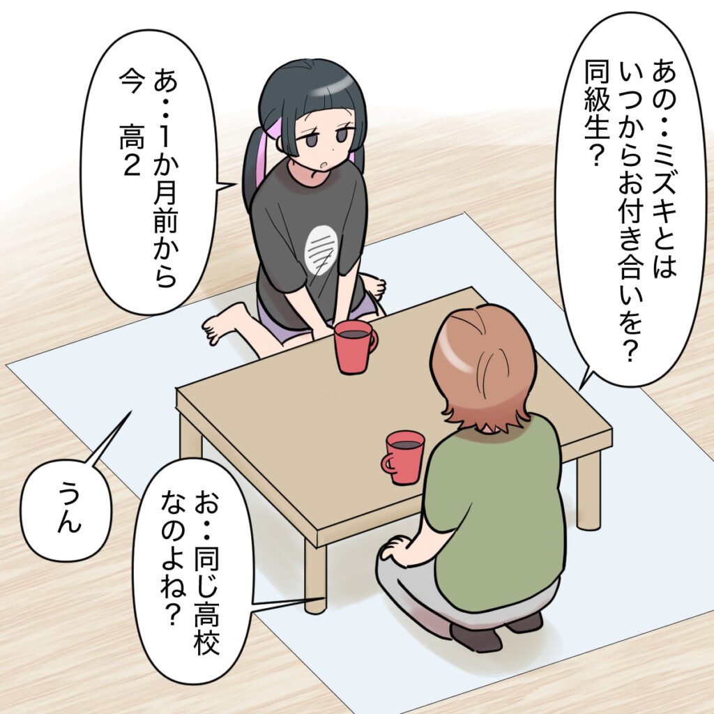 「あの・・ミズキとはいつからお付き合いを?同級生?」とたずねると、「あ・・1か月前から。今高2」エリカちゃんの言葉に「お・・同じ高校なのよね?」そう言うと、「うん」エリカちゃんが頷きました。