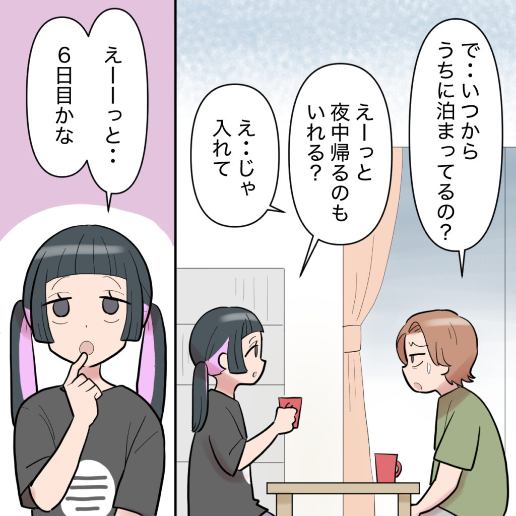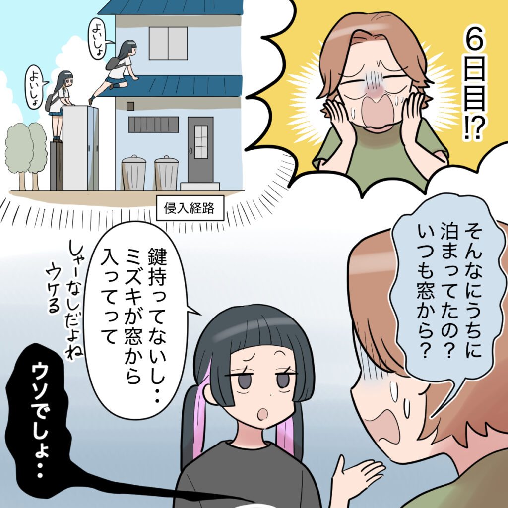 エリカちゃんの言葉に「6日目!?」と驚いて、「そんなにうちに泊まってたの?いつも窓から?」と言うと、「鍵持ってないし・・ミズキが窓から入ってって・・しゃーなしだよね。ウケる」と答えるエリカちゃんの言葉に、「ウソでしょ・・」と絶望的な気持ちに。