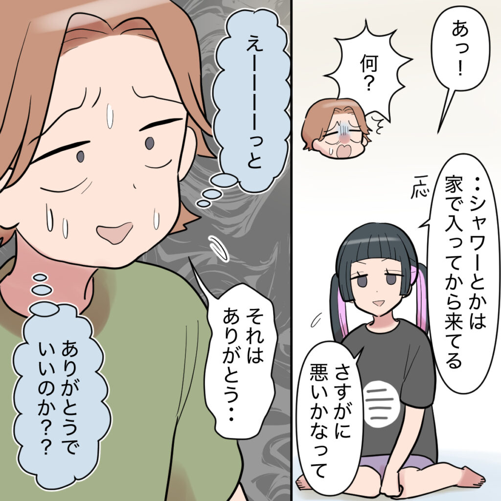 すると、「あっ!」突然大きな声を出すエリカちゃん。「何?」と聞くと、「・・シャワーとかは家で入ってから来てる。さすがに悪いかなって」ちょっぴりドヤ顔のエリカちゃん。「えーーーーーっと」と考え込んで、「それはありがとう・・」と答えながら、「ありがとうでいいのか??」と考え込んでいました。