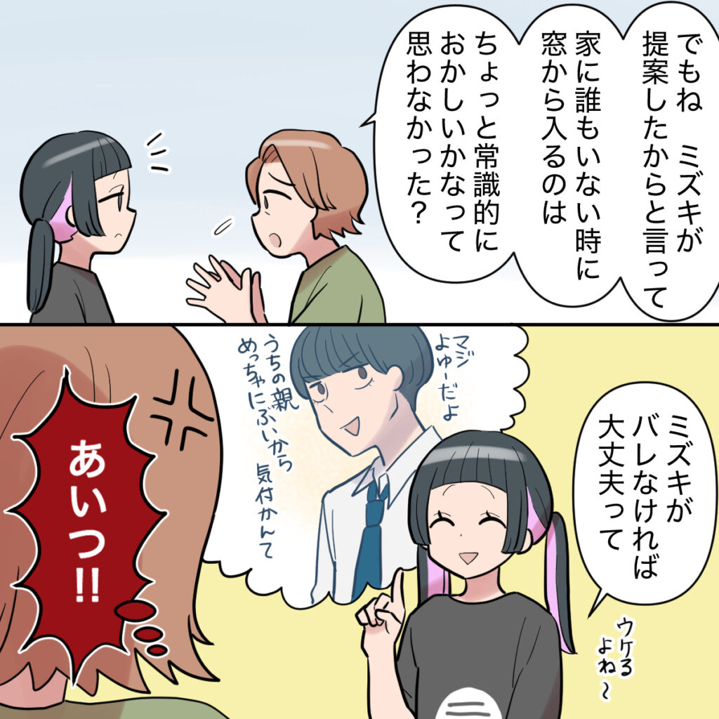 そして、「でもね、ミズキが提案したからと言って、家に誰もいない時に窓から入るのは、ちょっと常識的におかしいかなって思わなかった?」エリカちゃんにそう言うと、「ミズキはバレなければ大丈夫って。ウケるよね~」笑顔で答えるエリカちゃん。「マジよゆーだよ。うちの親めっちゃ鈍いから気づかんて」ミズキの言葉を想像し、「あいつ!!」と怒りがこみ上げました。