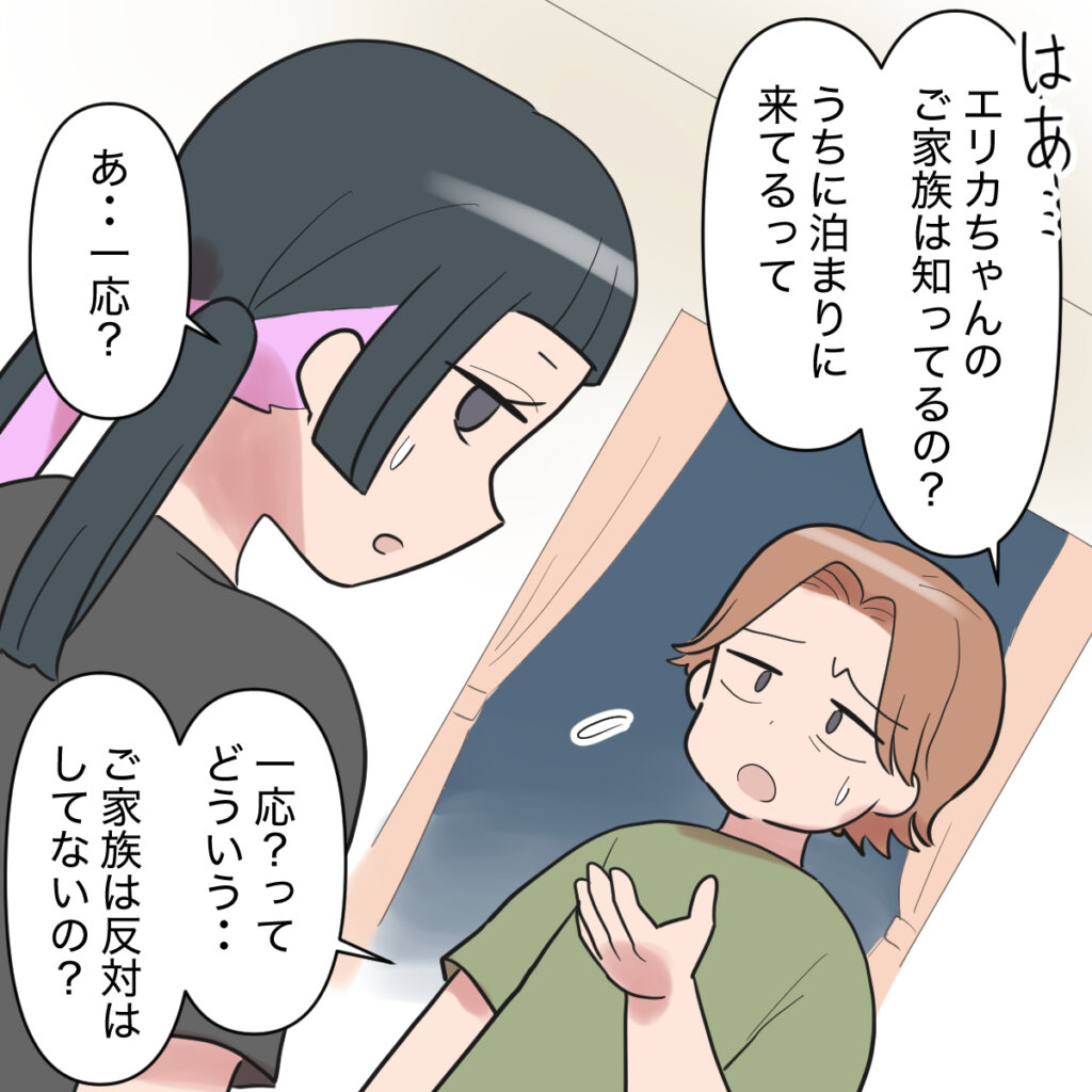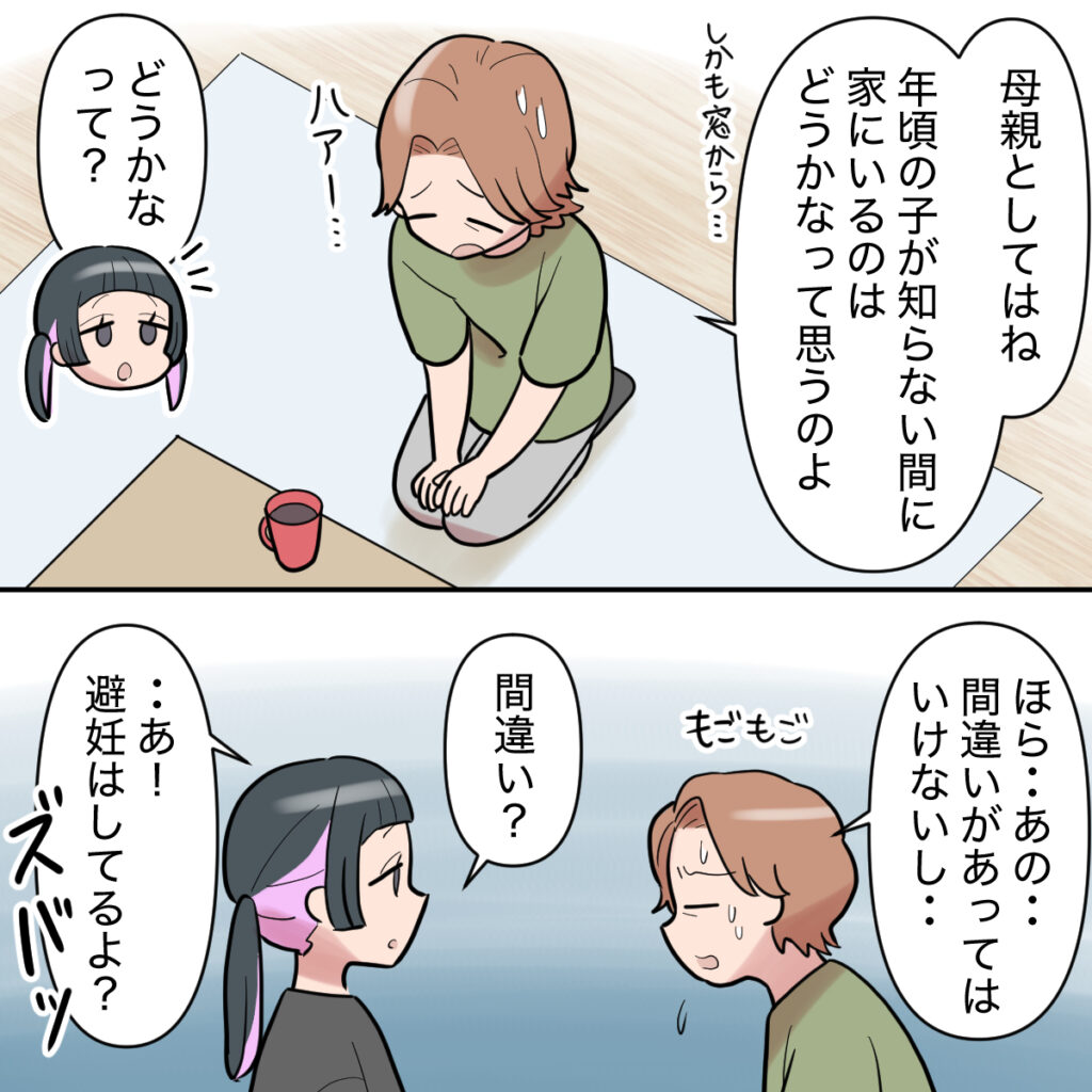 「バレなきゃ大丈夫」とミズキが誘導したとはいえ、親の私が知らない間に6日も連泊しているなんて普通ではありえないなと思い「母親としてはね、年頃の子が知らない間に家にいるのはどうかなって思うのよ。」と話しても、エリカちゃんは「どうかなって?」とキョトンとしています。「ほら、あの、間違いがあってはいけないし。」と口ごもると、エリカちゃんに「あ!避妊はしてるよ?」とズバッと言われてしまいました。