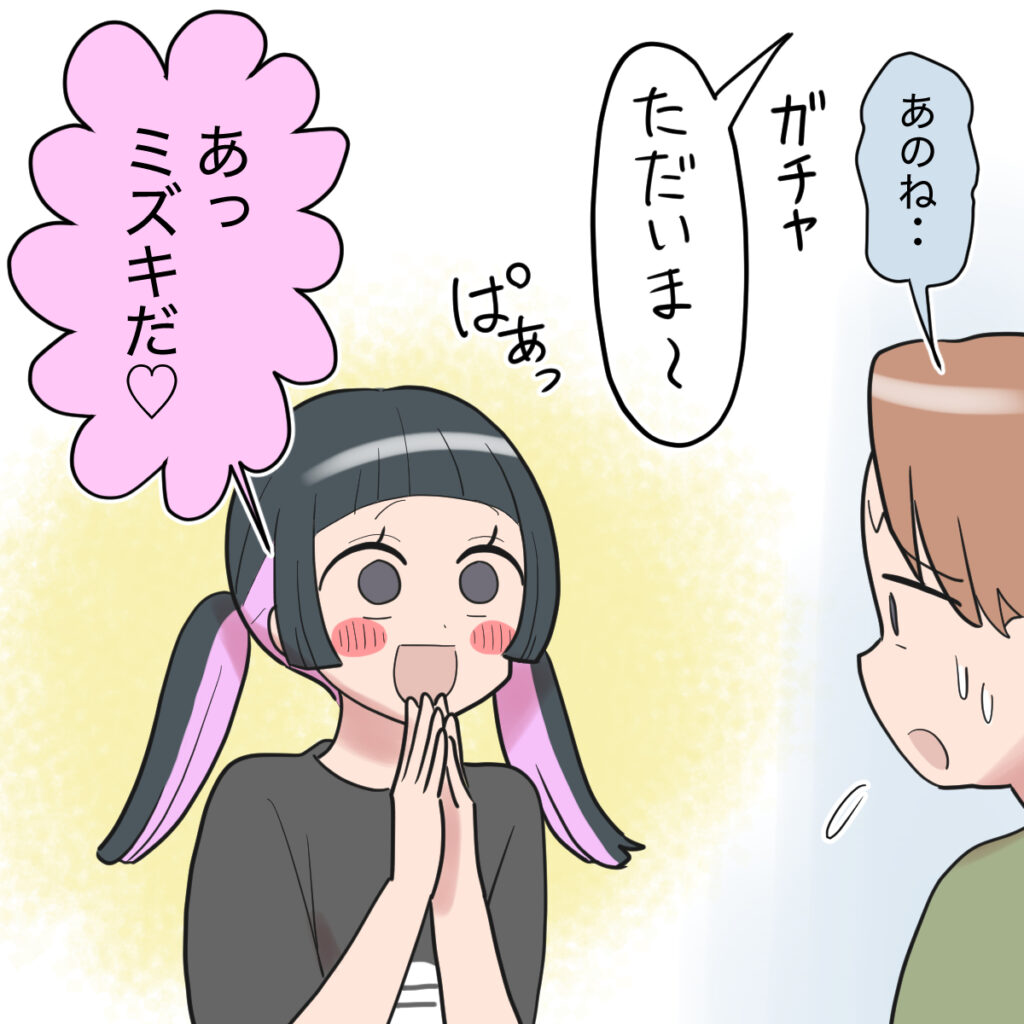 家出をかくまったと思われても大変。「あのね」と諭そうとしたタイミングで「ただいま~」とのんきにミズキが帰ってきました。「あっミズキだ」とぱぁっと明るい顔になったエリカちゃんです。