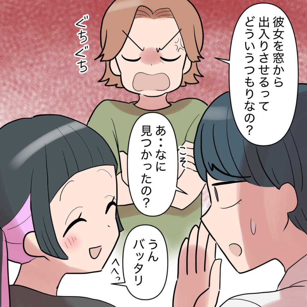 息子ミズキの部屋に窓から侵入していたエリカちゃん。もう6日も泊っていると聞いたところでミズキが帰ってきました。リビングで私と話しているエリカちゃんを見るなりギョッとして「え!?なに!?どういうこと!!」と言いましたがそれはこっちのセリフ!「あんた!ちょっとここに座りなさい!!」とミズキを座らせました。