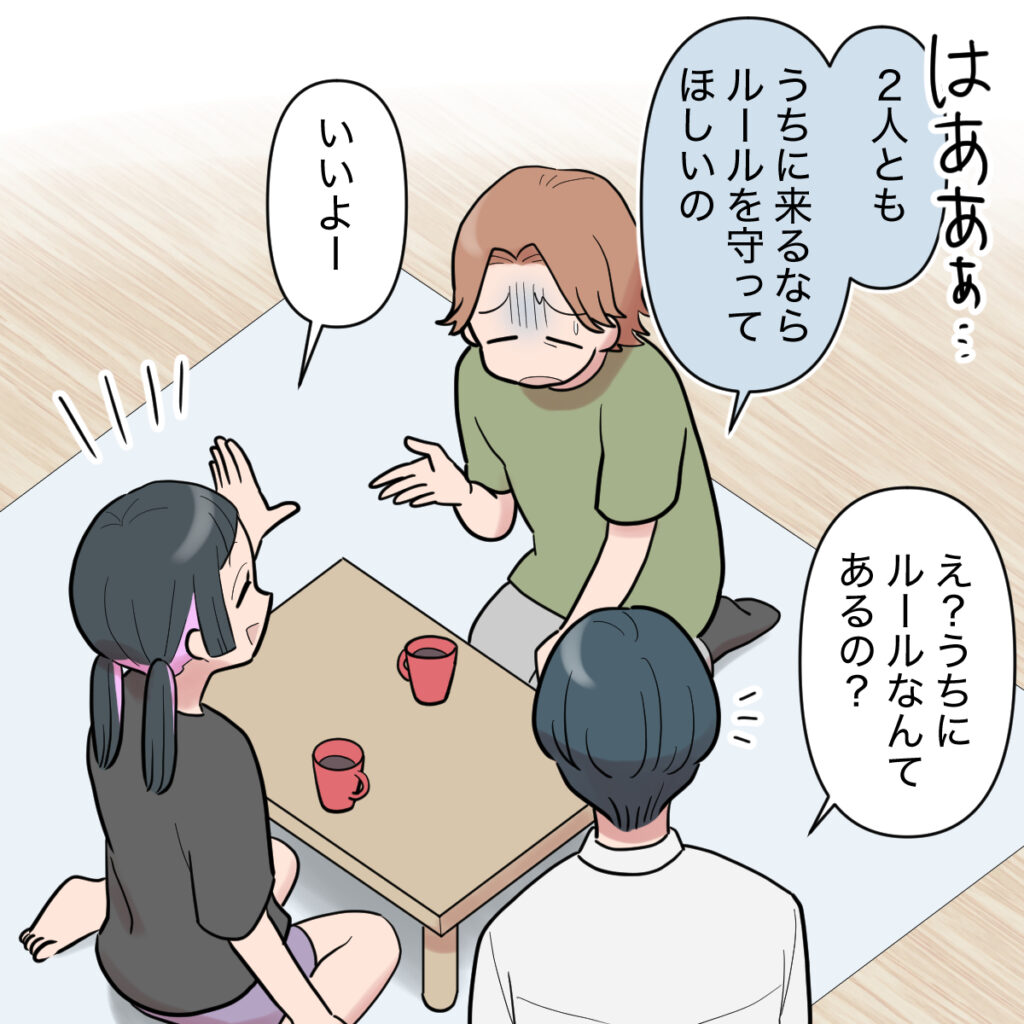 「はぁああ・・・2人とも、うちに来るならルールを守ってほしいの」私がそう言うと、「え?うちにルールなんてあるの?」とミズキが驚いて言いました。それに対して「いいよー」と手を挙げるエリカちゃん。
