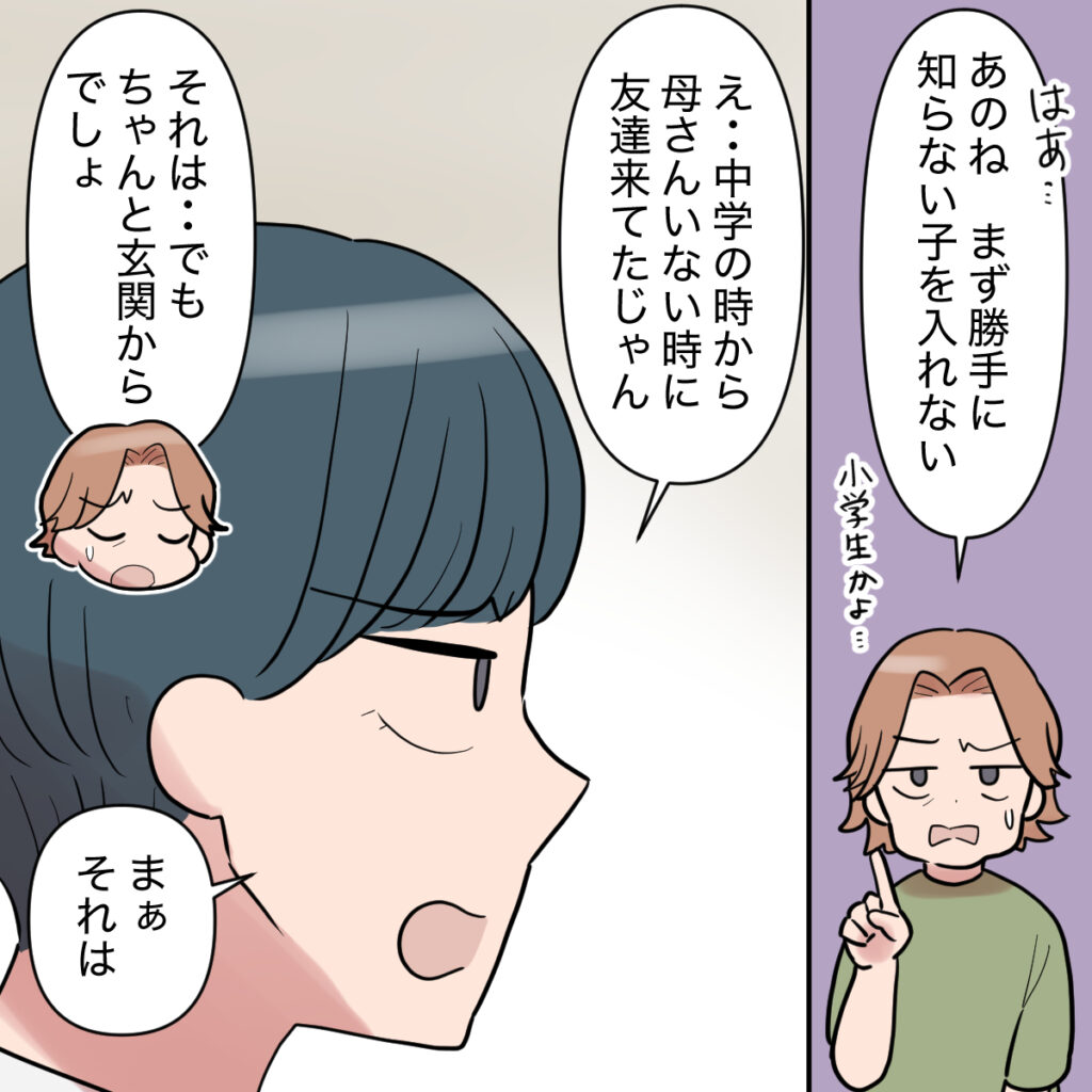 「はぁ・・あのね、まず勝手に知らない子を入れない」小学生かよと思いながらそう言うと、「え・・中学の時から母さんいない時に友達来てたじゃん」とミズキが反論。「それは・・でも、ちゃんと玄関からでしょ」私の言葉に、「まぁ、それは」とミズキが渋々答えました。