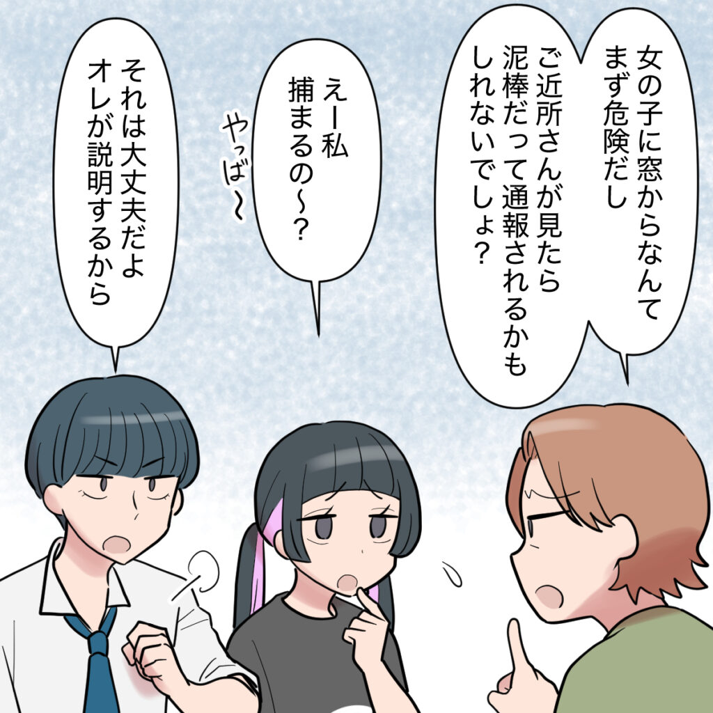 「女の子に窓からなんて、まず危険だし。ご近所さんが見たら泥棒だって通報されるかもしれないでしょ?」私の言葉に、「えー私捕まるの~?やっば~」エリカちゃんがそう言い、それを聞いたミズキが「それは大丈夫だよ。オレが説明するから」と自信満々に言いました。