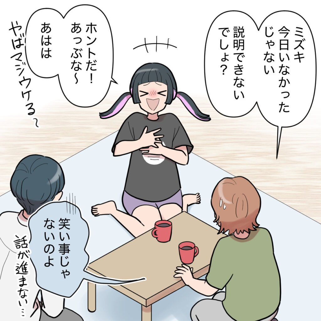 「ミズキ今日いなかったじゃない。説明できないでしょ?」私の言葉に、「ホントだ!あっぶな~あはは!やばマジウケる~」と笑うエリカちゃん。「笑いごとじゃないのよ」と困ってしまいました。