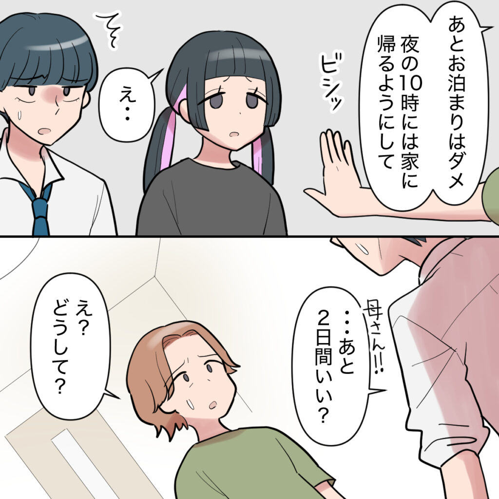 そして、「あとお泊まりはダメ。夜の10時には家に帰るようにして」私がビシッと言うと、「え・・」と戸惑うエリカちゃん。それを聞いていたミズキが、「母さん!・・あと2日間いい?」と言い出し、「え?どうして?」と聞き返しました。