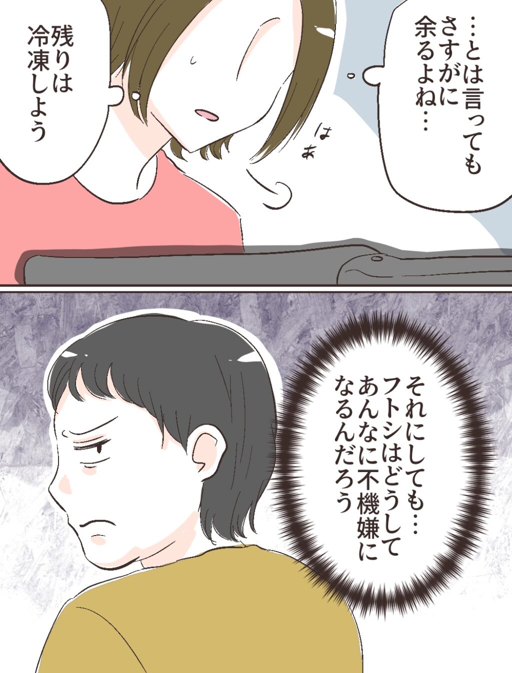 明日からの食事のことを考えていると、フトシがまだイライラしたまま「外で食ってくるわ~」と食事中の私たちに言い捨てて出かけていきました。苦手な野菜が食卓に出たからと言って家族との食事を拒否して外食に出かけるフトシにもう何も言わず、私はただ大きなため息をつきました。