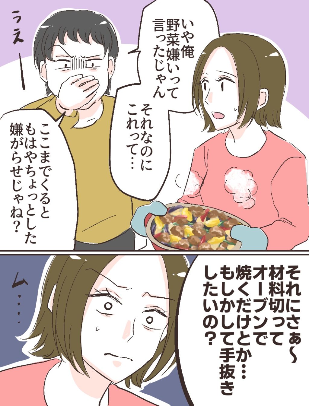 料理に野菜が入っているだけで「嫌がらせじゃね?」と言われてしまいました。しかも「材料切ってオーブンで焼くだけとか・・・もしかして手抜きしたいの?」と嫌味まで。一生懸命考えて作った料理に野菜が入っていることでさんざんな言われようで、私はさすがにムッとしました。