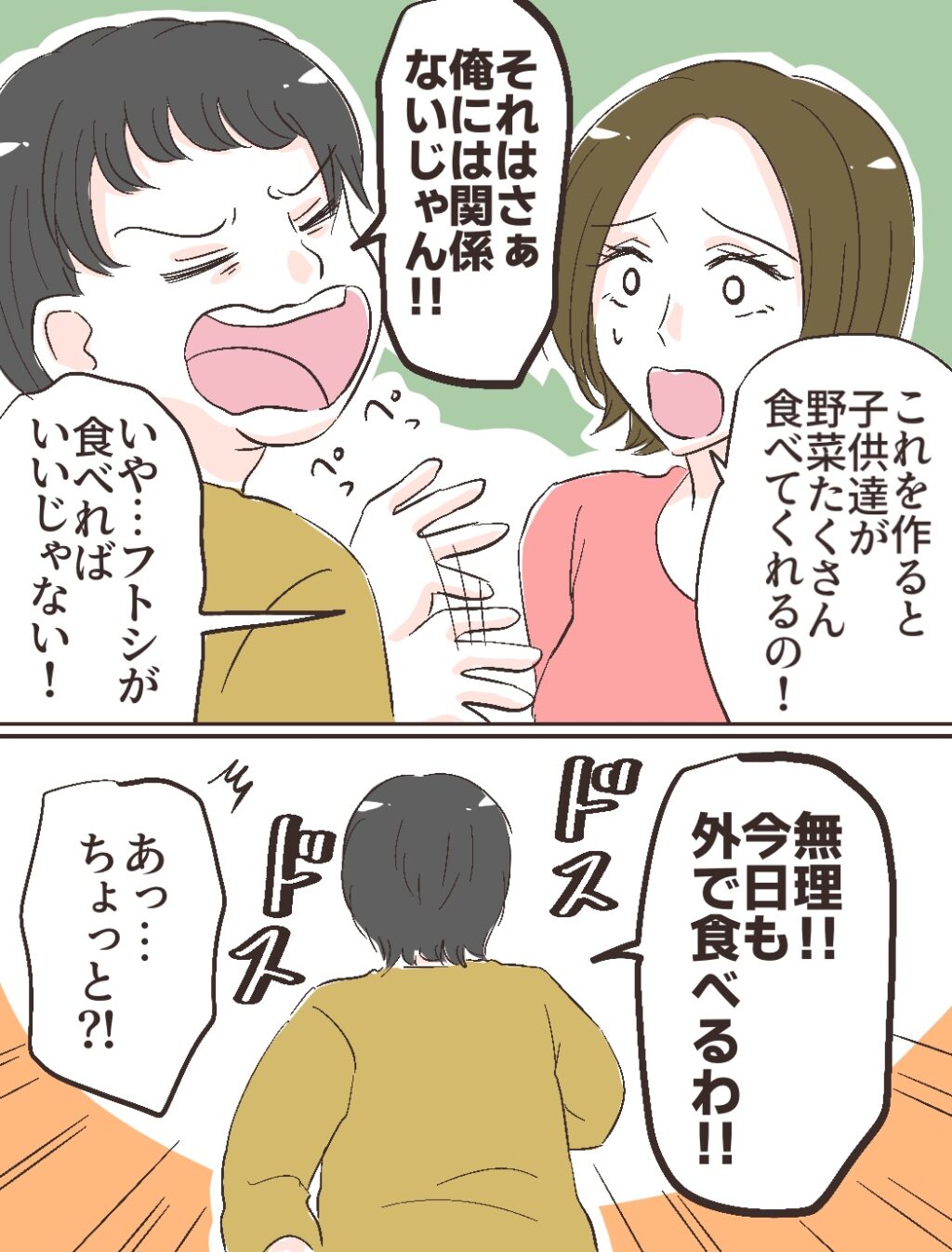 しかも、毎回の料理をフトシの好みだけに合わせて作るわけにはいきません。「これを作ると子どもたちがたくさん食べてくれるの!」と言っても「俺には関係ない」と言って全く聞き耳を持ちません。とうとう「無理!今日も外で食べるわ!」と言ってさっさと出かけてしまいました。
