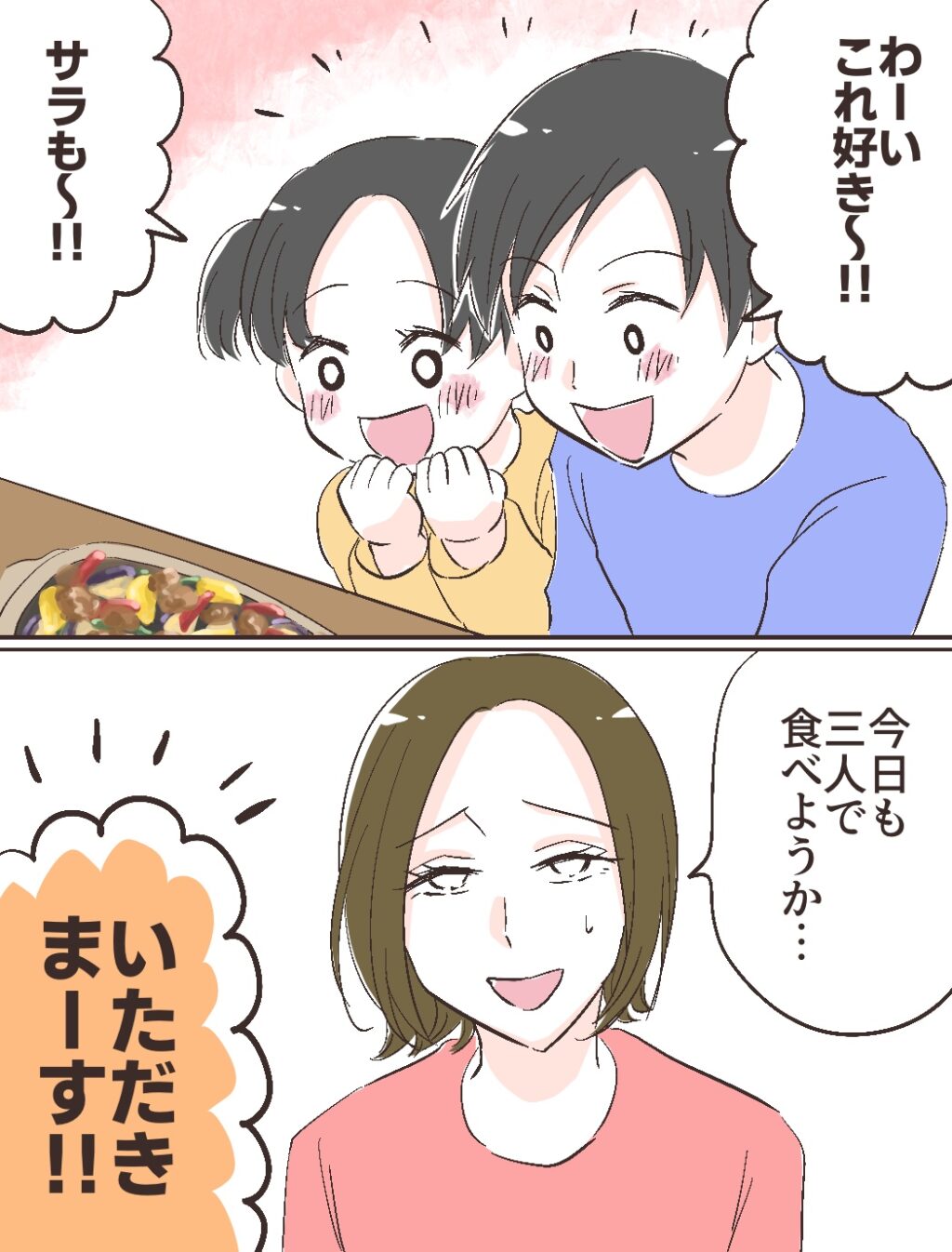 子どもたちは「わーいこれ好きー」と言って喜んでくれたので、その笑顔に救われた気持ちにはなりましたが、「今日も3人で食べようか・・・」フトシのことを考えると切ない気持ちになりました。