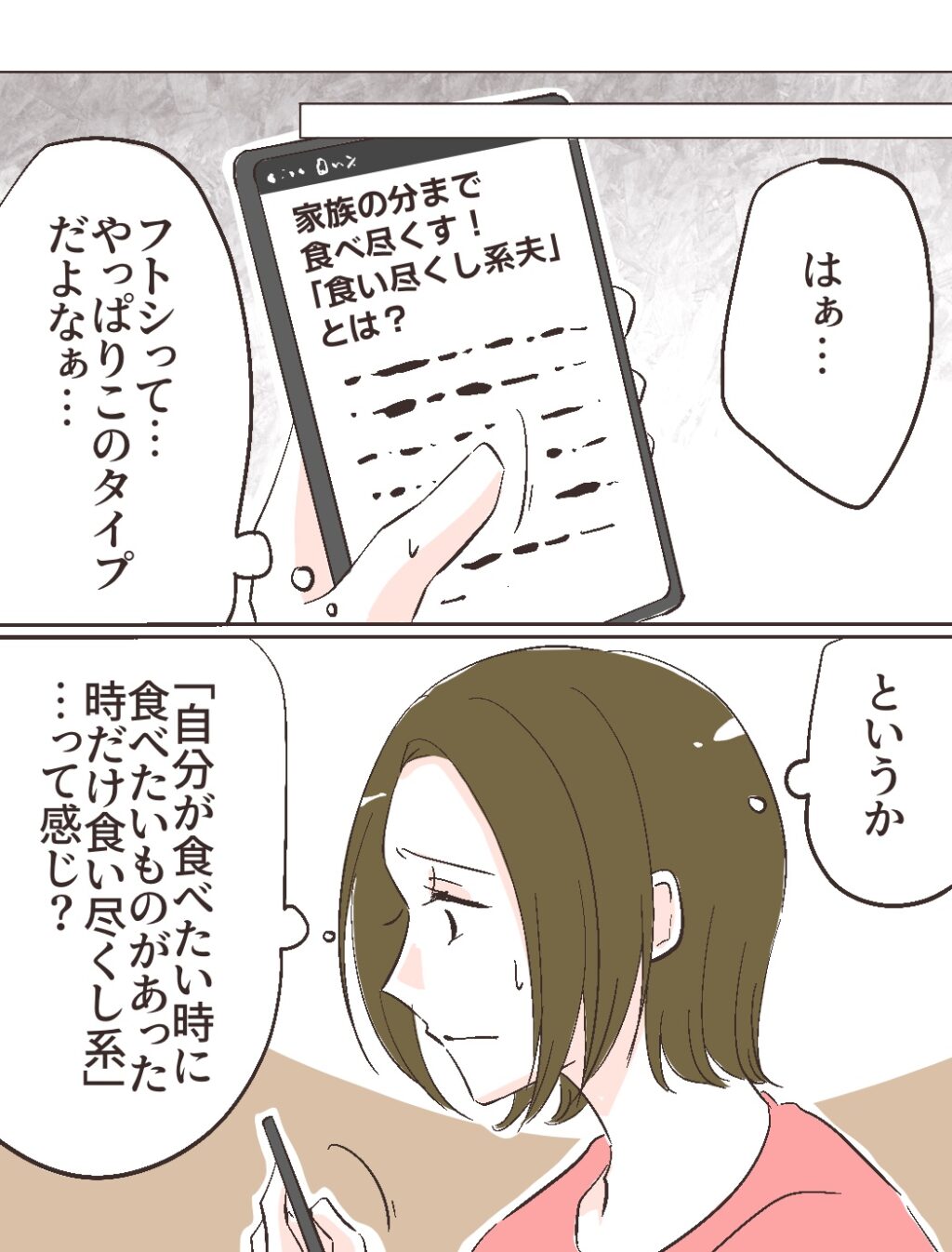 『食い尽くし系夫』と検索して出てくる記事を読みながら、フトシに当てはまるものばかりと思いましたが、フトシの場合は「自分が食べたい時に食べたいものがあった時だけ食い尽くし系」。正直、かなりめんどくさいタイプかな、とため息しか出てきませんでした。