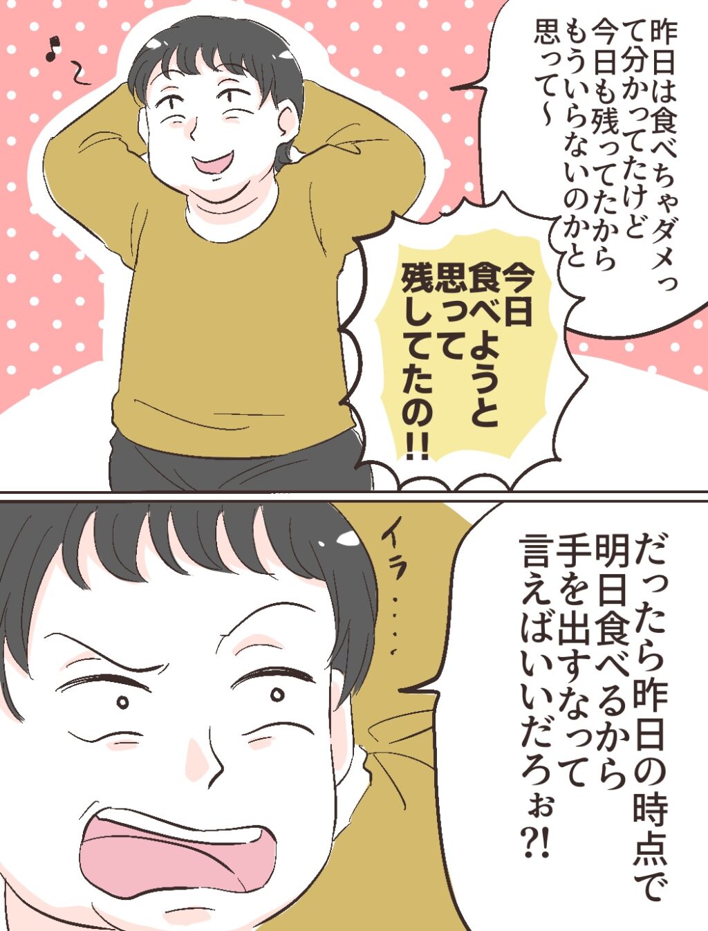 「昨日は食べちゃダメってわかってたけど、今日も残ってたからもういらないのかと思って~」と鼻歌を歌いながら言うフトシに、「今日食べようと思って残してたの!!」と反論すると、「だったら昨日の時点で明日食べるから手を出すなって言えばいいだろぉ!?」フトシがイライラしながら言い、