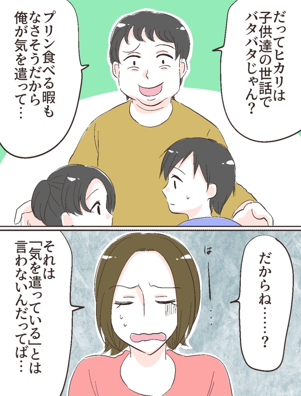 「だってヒカリは子ども達の世話でバタバタじゃん?プリン食べる暇もなさそうだから俺が気を遣って・・」と上から目線でえらそうに言うフトシに、「はぁー・・だからね・・?それは『気を遣っている』とは言わないんだってば・・」と呆れて言い返すと、