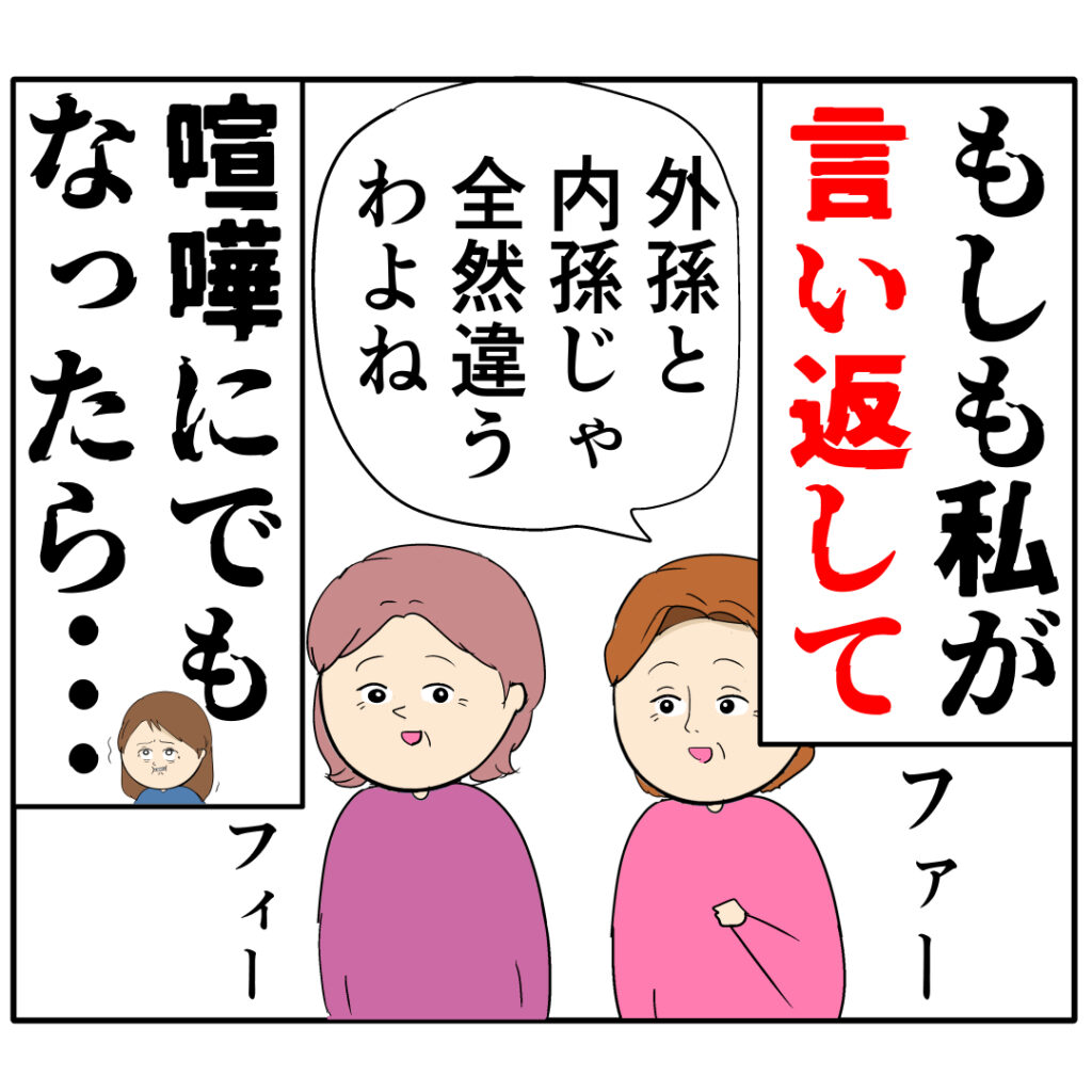さくらさんの気も知らず「外孫と内孫じゃ全然違うわよね」と盛り上がる義母と義伯母。そんな二人を横目に「もしも私が言い返して喧嘩にでもなったら・・」とさくらさんは必死に怒りを堪えます。
