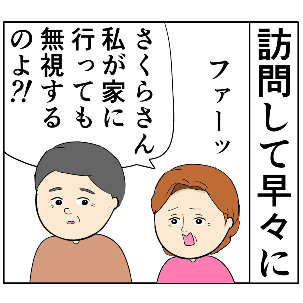 さくらさん達が義実家に訪問して早々、義母は次郎さんに「さくらさん、私が家に行っても無視するのよ?!」とさくらさんの愚痴。