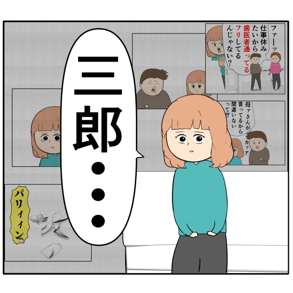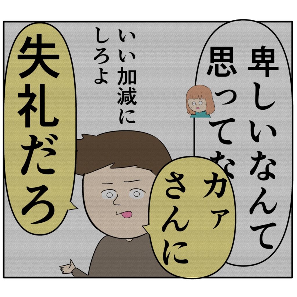 モモさんは必死に「そんな目で見てません」「卑しいなんて思ってない」と否定しましたが、三郎さんはモモさんの言葉に耳を傾けることなく「カァさんに失礼だろ。いい加減にしろよ」とモモさんを責めました。