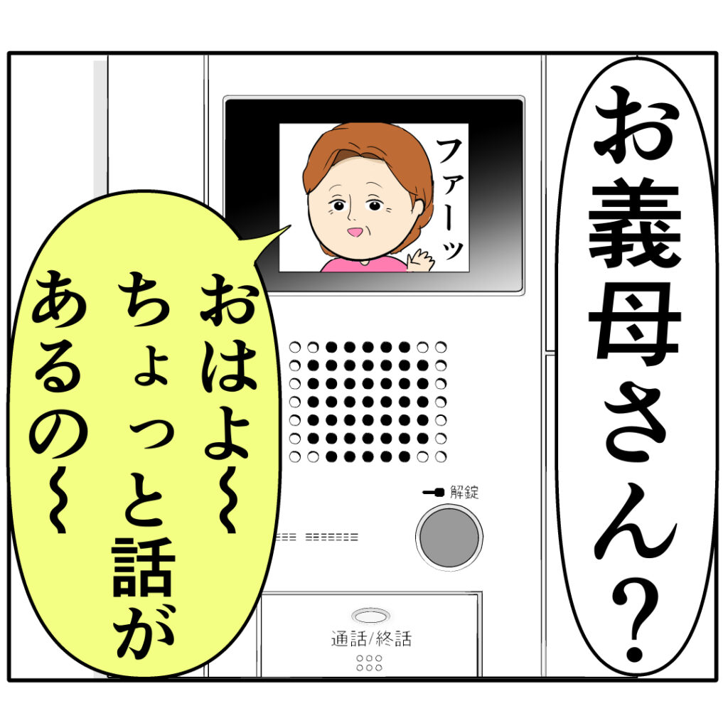 インターホンの画面を見ると、笑顔の義母が映っていました。朝からアポなし訪問してきた義母に驚きながらさくらさんが通話ボタンを押すと「おはよ~。ちょっと話があるの~」と義母が言いました。