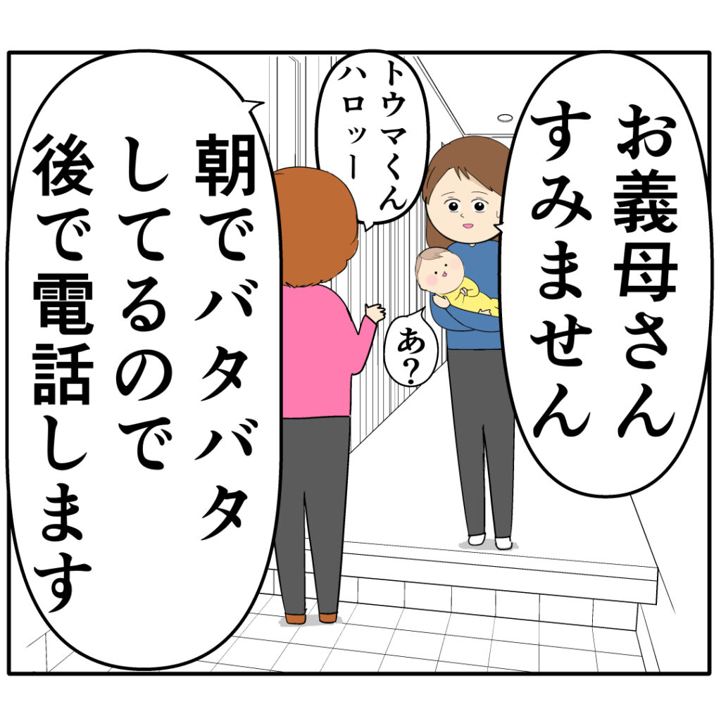 トウマくんを寝かせようと思っていたタイミングだったため、玄関に入ってきた義母に「お義母さんすみません。朝でバタバタしてるので後で電話します」とさくらさんは申し訳なさそうに言いました。