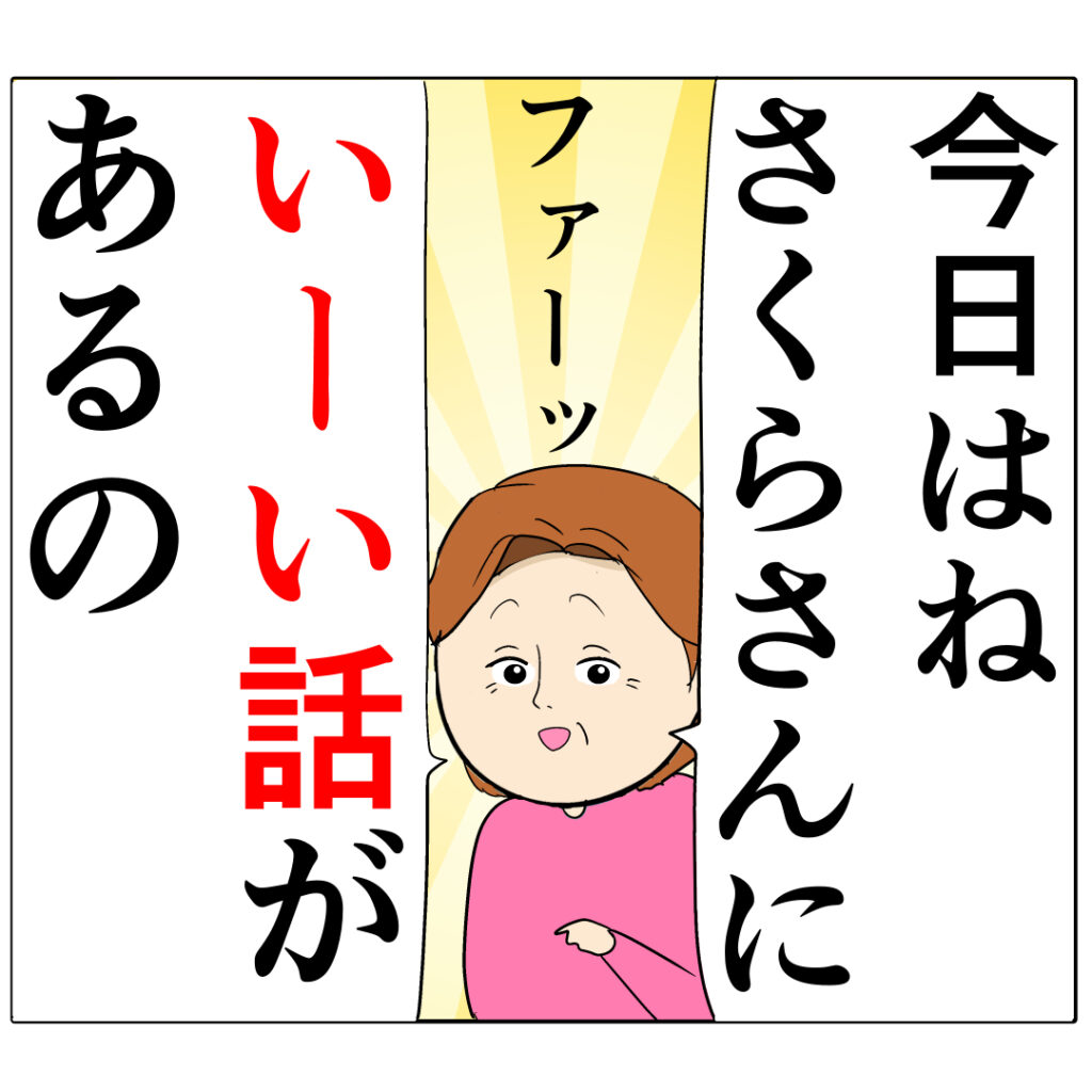 リビングに行くと、さっそく義母は「今日はね、さくらさんにいーい話があるの」と満面の笑みで切り出しました。