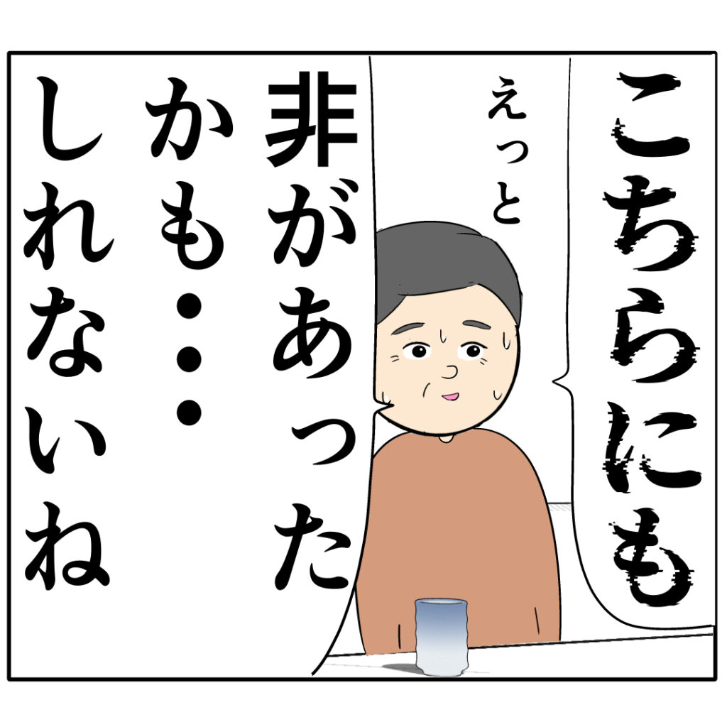 義母から意見を求められた義父は、「こちらにも非があったかも・・しれないね」と激怒する義母の顔色を伺いながら言いにくそうに言いました。「何言ってるの?!」と激高する義母をなだめながら、義父はさくらさんに絶縁を考え直してほしいとお願いしますが、さくらさんは「嫁と嫁の家族を大切にしないお義母さんを大切にできません」とバッサリ。そして、「絶縁しかありません」ときっぱり言いました。