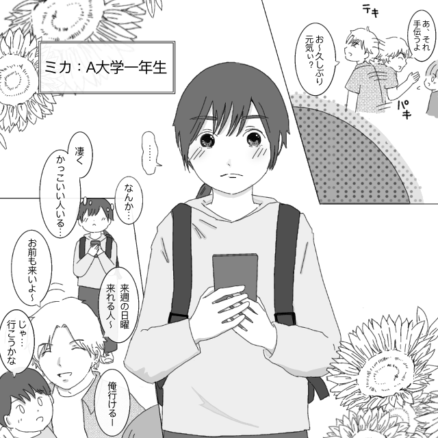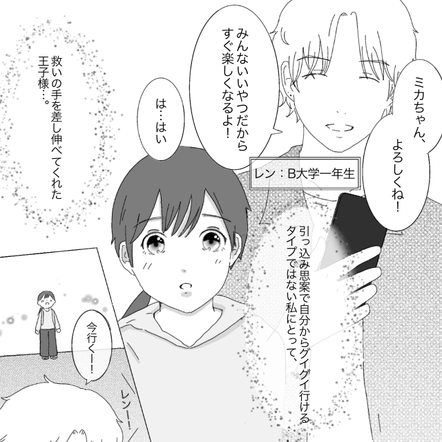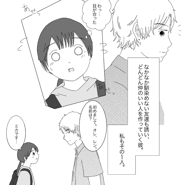 「ミカちゃん、よろしくね!みんないいやつだからすぐ楽しくなるよ!」レン君は優しくそう言ってくれました。引っ込み思案で自分からグイグイ行けるタイプではない私にとって、レン君は救いの手を差し伸べてくれた王子様でした。