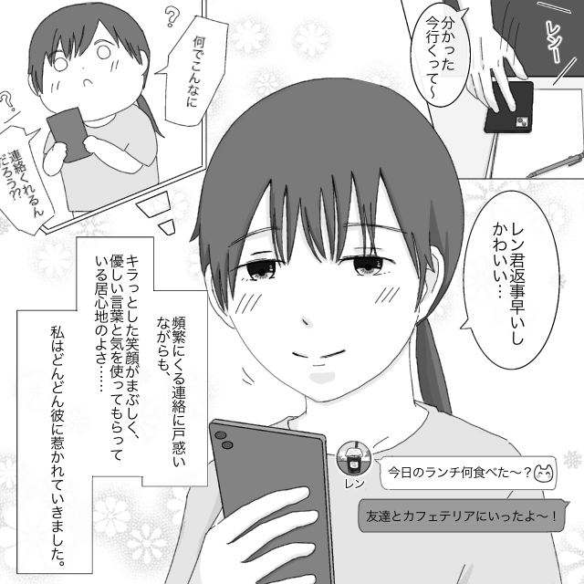 「レン君、返事早いしかわいい・・。でも、何でこんなに連絡くれるんだろう??」レン君から頻繁にくる連絡に戸惑いながらも、キラッとした笑顔がまぶしく、優しい言葉と気を遣ってもらっている居心地のよさを感じ・・私はどんどんレン君に惹かれていきました。