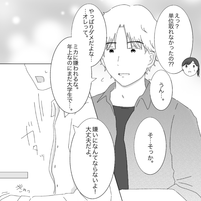 就職活動が落ち着いた頃、レンから呼び出された私は、単位が足りず大学を卒業できないことを知らされました。「やっぱりダメだよなオレって、ミカに嫌われるな、年上なのにまだ大学生で・・・」と落ち込んだ様子で話すレン。私はとっさに、「嫌いになんてならないよ!大丈夫だよ」と言います。