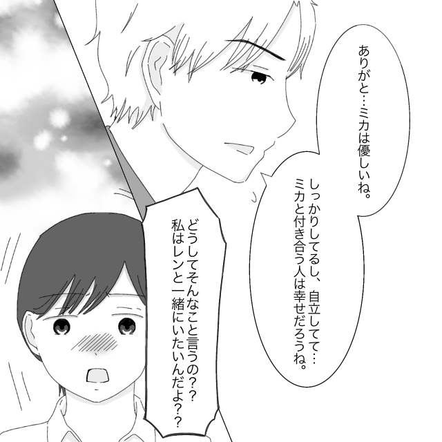 レンはうつむきながら「ミカは優しいね、しっかりしてるし、自立してて・・・ミカと付き合う人は幸せだろうね」とつぶやきます。私に相応しい人は他にいるみたいな言い方に、私は思わず「どうしてそんなこと言うの?私はレンと一緒にいたいんだよ?」と必死になってしまいました。