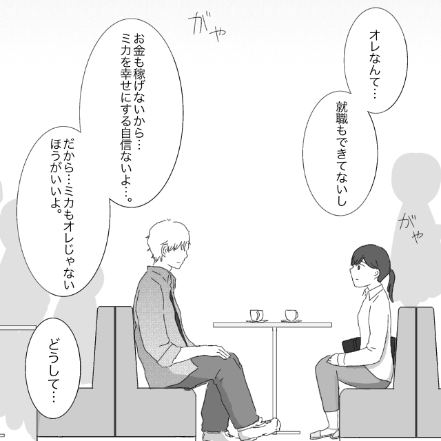 「オレなんて、就職もできてないしお金も稼げないから、ミカを幸せにする自信ないよ・・・だからミカもオレじゃないほうがいいよ」と話すレン。がやがやと騒がしい店内で、レンの言葉だけがはっきりと私の耳に届きました。