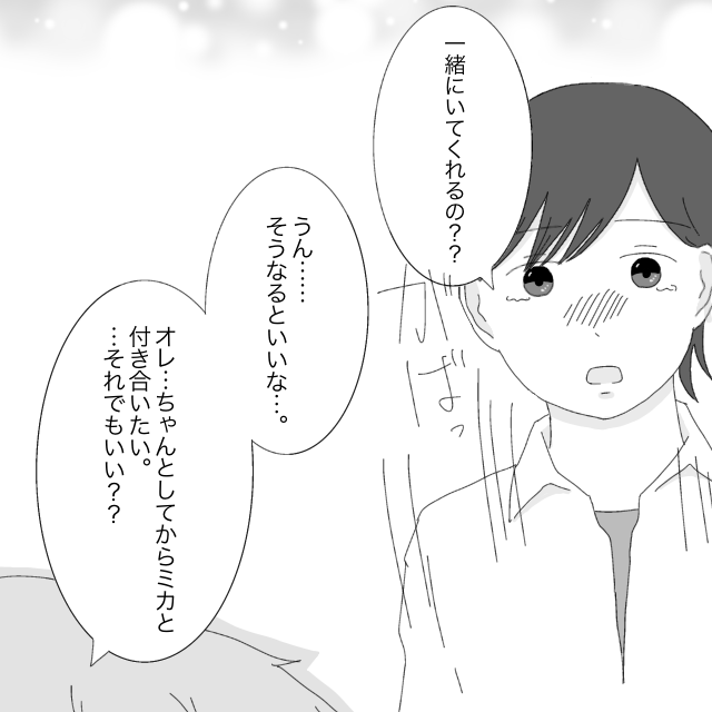 レンの言葉に、私は勢い良くうつむいていた顔を上げ、「一緒にいてくれるの?」と言いました。「オレ、ちゃんとしてからミカと付き合いたい・・・それでもいい?」いつになく真剣な眼差しに、私の目には涙が浮かびます。