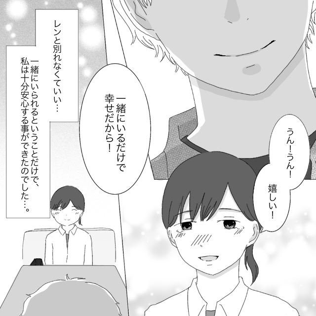 「うん、うん!嬉しい!一緒にいるだけで幸せだから!」私は笑って答えました。レンの口から「付き合いたい」という言葉が出てきたこと、レンとこの先も一緒にいられること、それだけで私は十分安心することができたのです。