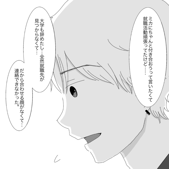 「ミカにちゃんと付き合おうって言いたくて就職活動頑張ってたけど・・大学も辞めたし・・全然就職先が見つからなくて・・だから合わせる顔がなくて・・連絡できなかった」レンの言葉を聞いて、