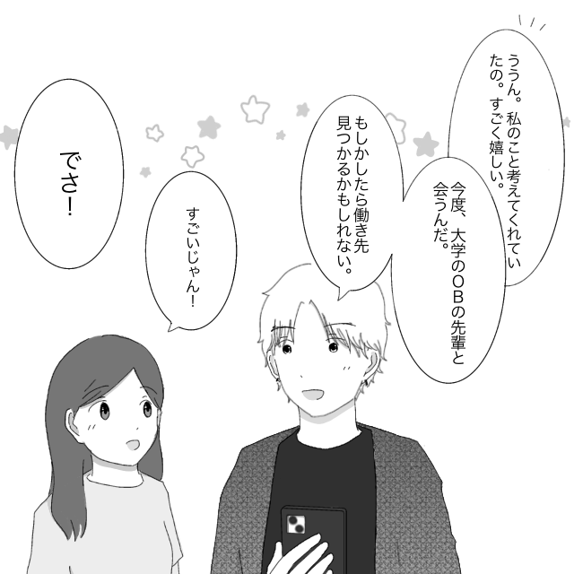 「ううん。私のこと考えてくれていたの。すごく嬉しい」私がそう言うと、「今度、大学のOBの先輩と会うんだ。もしかしたら働き先見つかるかもしれない」レンの言葉に「すごいじゃん!」と言うと、「でさ!」と話を切り出すレン。