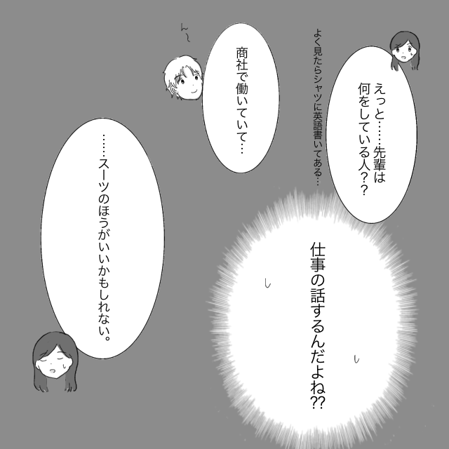 「えっと・・先輩は何をしている人??」とたずねながら、「よく見たらシャツに英語書いてある・・仕事の話するんだよね??」と心の中はパニック!「商社で働いていて・・」レンの言葉を聞いて、「・・スーツの方がいいかもしれない」と言うと、