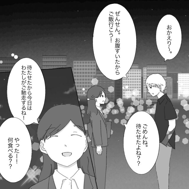「おかえり~」と笑顔を向けるレンに「ごめんね。待たせたよね?」と謝ると、「ぜんぜん。お腹すいたからご飯行こう!」と明るく言ってくれました。「待たせたから今日はわたしがご馳走するね!」と言うと、レンは「やったー!何食べる?」と無邪気に喜びました。