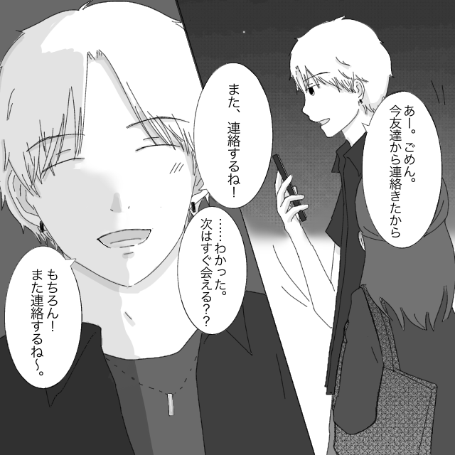 レンはスマホを見ながら「あー。ごめん。今友達から連絡来たから」とさらり。「また、連絡するね!」と笑顔で言われてしまい「・・わかった。次はすぐ会える??」としょんぼりしながら聞くと、「もちろん!また連絡するね~」とにっこり微笑むレン。