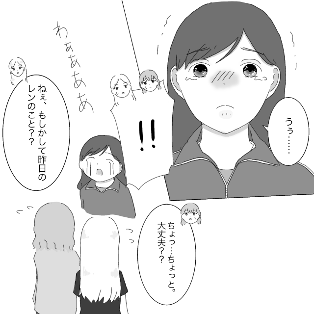 「レンの」と言われて「うぅ・・」とまた涙がこみ上げてしまい、それを見た2人はビックリ!「わぁあああ」と泣き出す私に、「ちょっ・・ちょっと。大丈夫??」「ねぇ、もしかして昨日のレンのこと??」と聞かれたのでした。